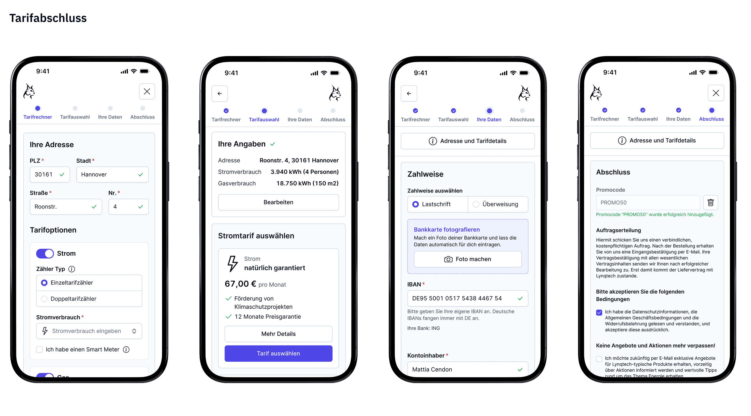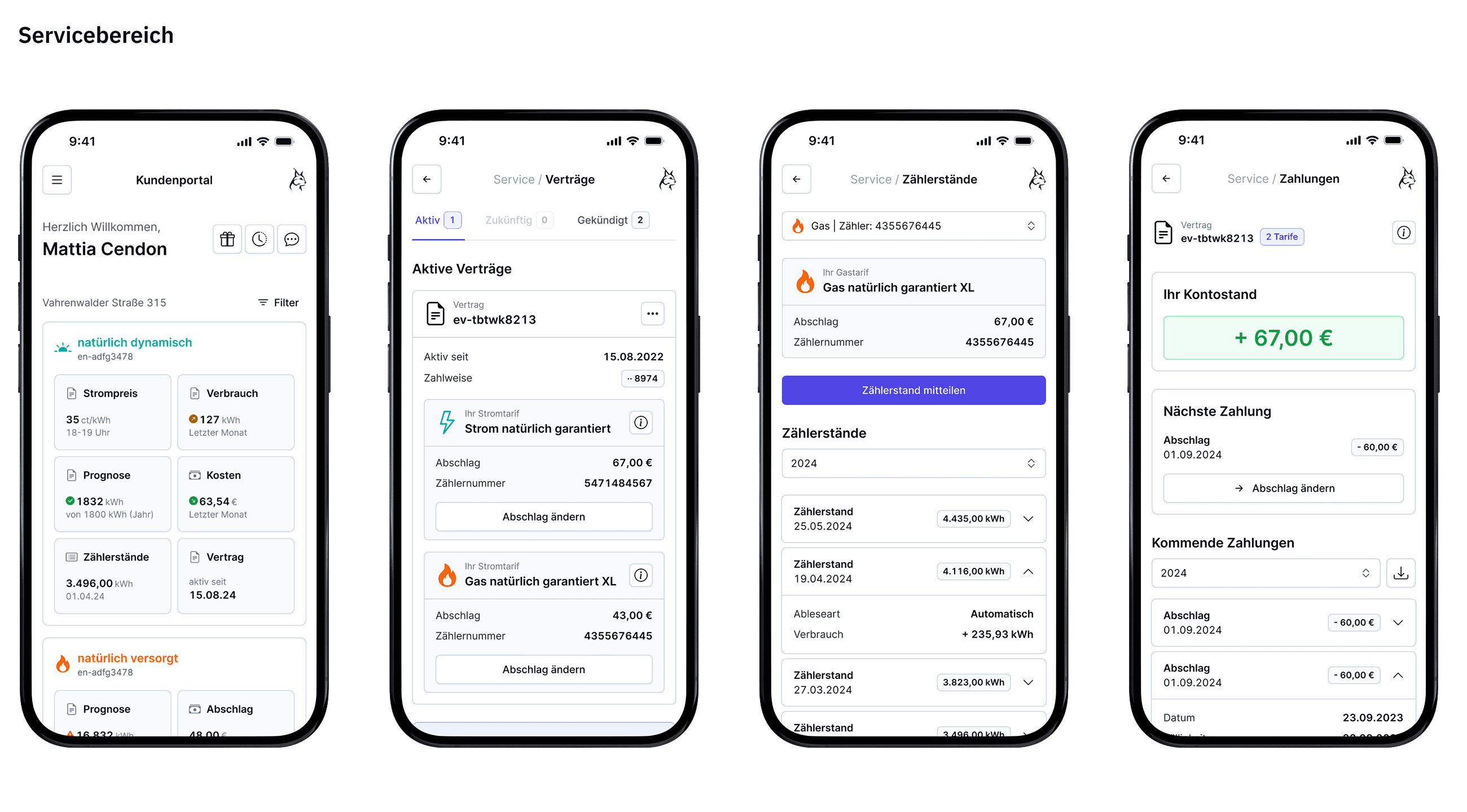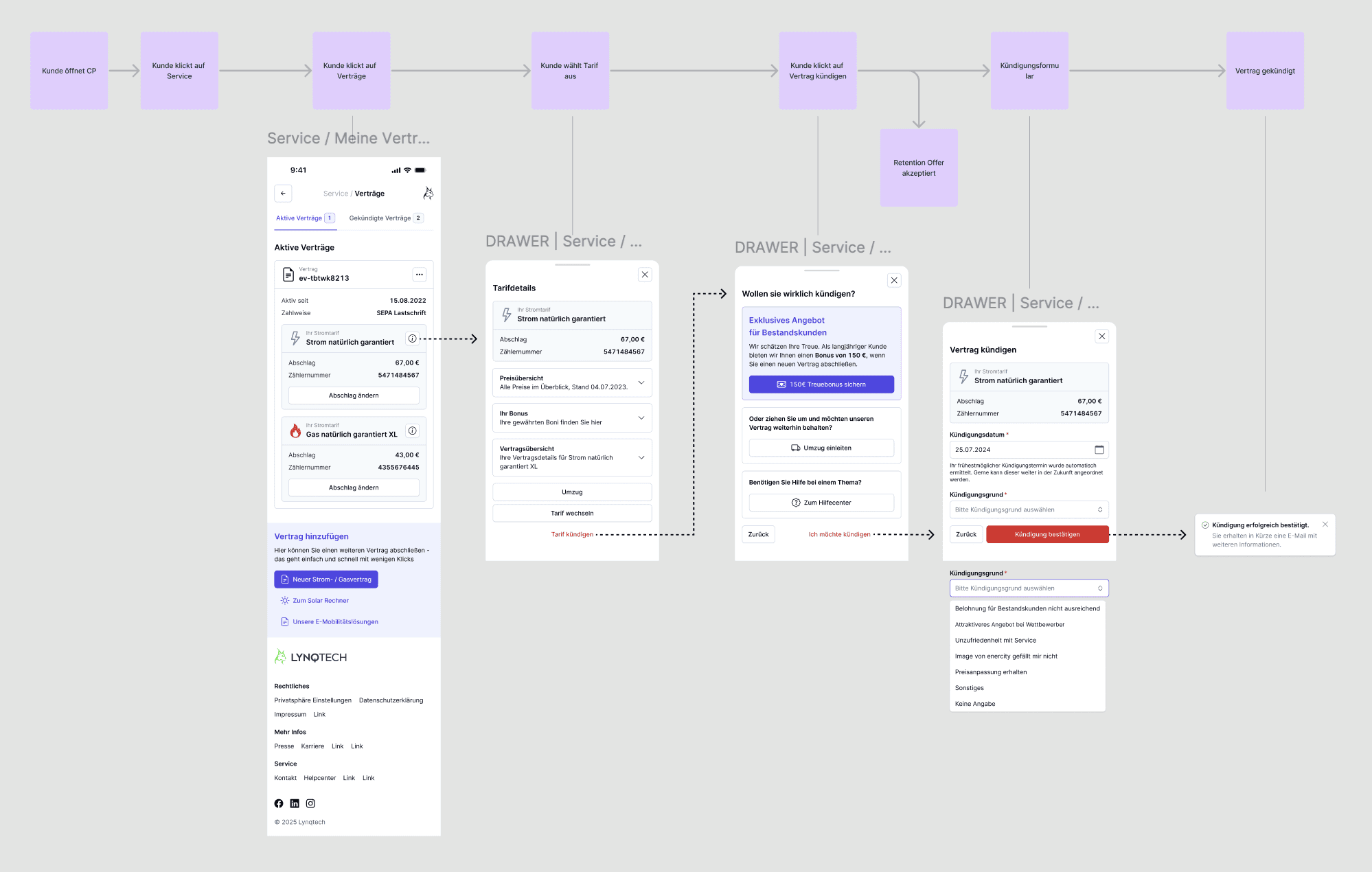 Entwicklung von User Flows und Wireframes für Kernbereiche wie Registrierung, Vertragsverwaltung, Rechnungen, Servicebereich sowie Verbrauchs- und Preisanalysen.